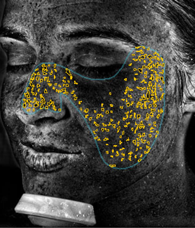 しわは細い線形が刻まれているので、周りより皮膚色が暗くなります。その特徴を捉えて、しわの数や状態を解析いたします。